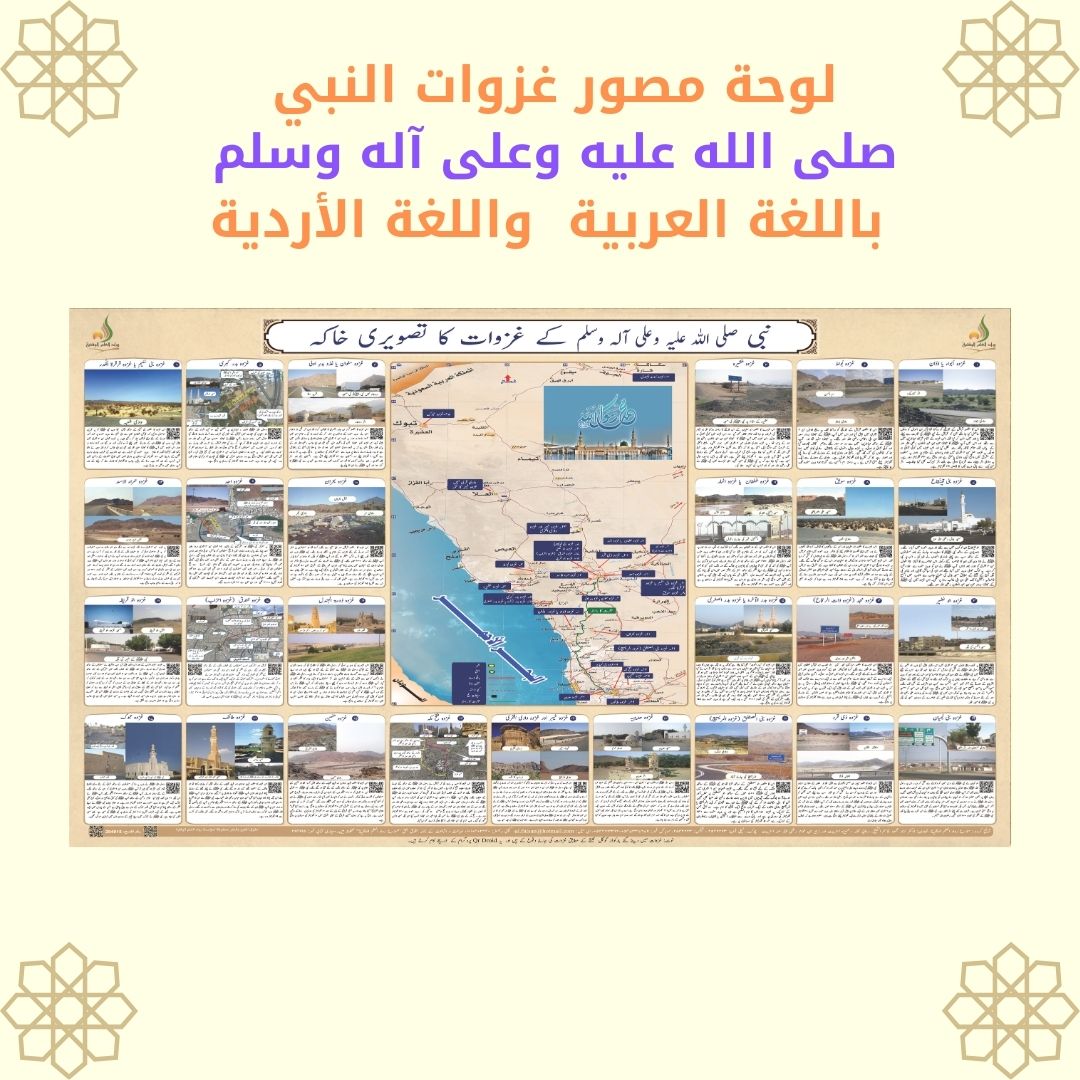 لوحة مقاس100*70 تضم غزوات النبي صلى الله عليه وسلم مع صور لمواقعها ورابط للموقع وخارطة توضح اماكن الغزوات في مواقعها واللوحة وجهين وجه عربي والآخر أوردو
