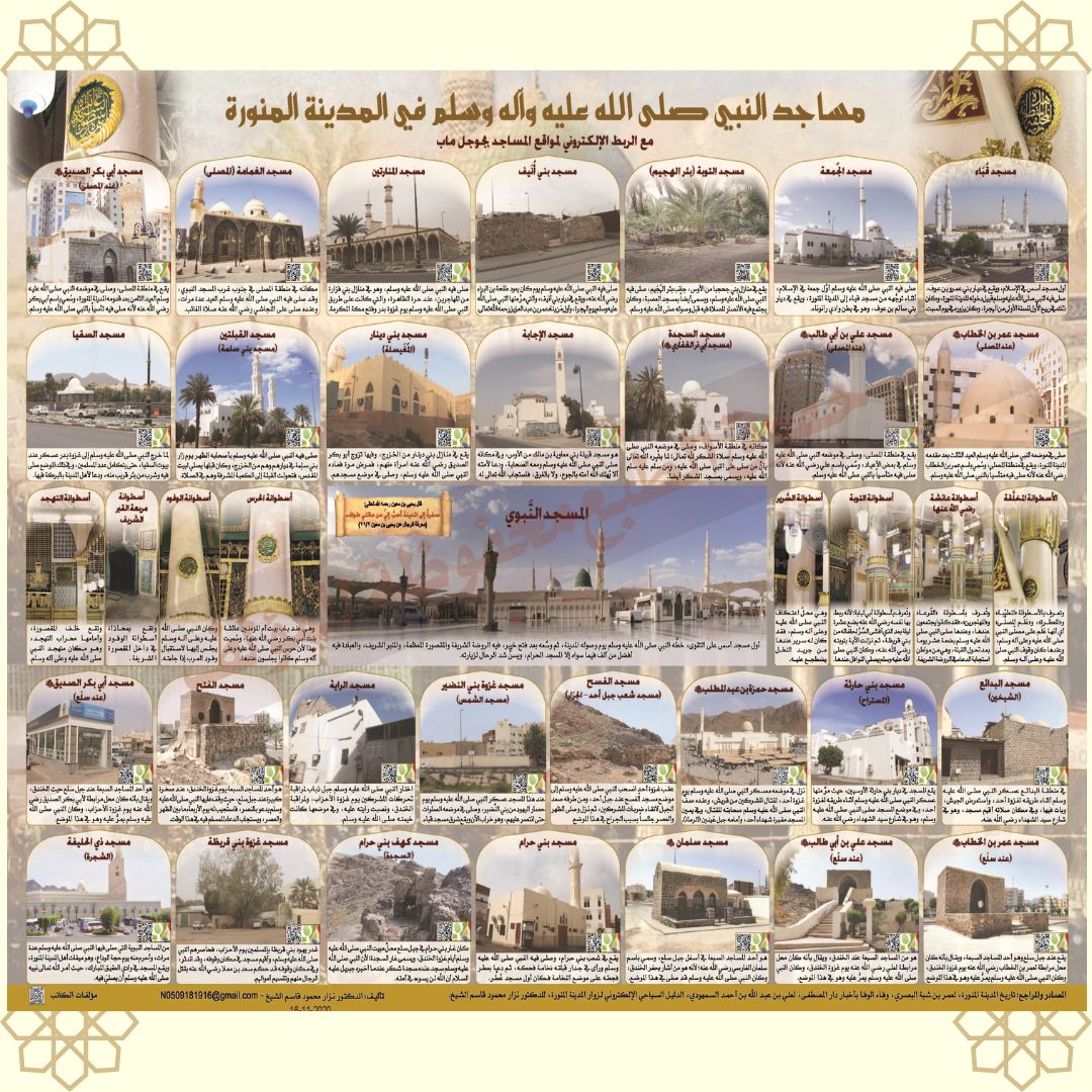 لوحة مقاس100*70 تضم مساجد النبي صلى الله عليه وسلم في المدينة المنورة مع صور لها وتعريف بها مع باركود لمواقعها