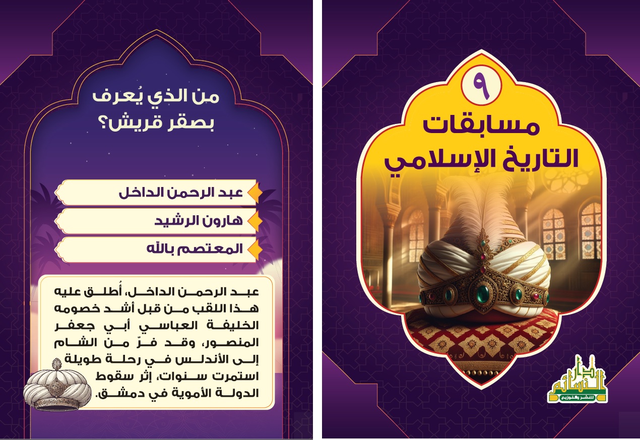 تحدي المعلومات أجمل المسابقات الإسلامية في كل بطاقة قصة وحكاية وفي كل سؤال سرّ من أسرار قصص وعلوم القرآن والرسل والأنبياء وأسرار السيرة النبوية ومعالمها التاريخية وقصص الصحابة والصحابيات وأمهات المؤمنين وتاريخ الخلفاء الراشدين والدول الإسلامية حيث الأحداث تتلاحق والبطولات تتسابق أسئلة شيّقة تكشف لك العِبر والعجائب تجعل التعلم مغامرة يحبها الصغار ويتنافس فيها الكبار خذ بطاقة وأعطني الأخرى ولنبدأ المنافسة لنصل للمعلومة