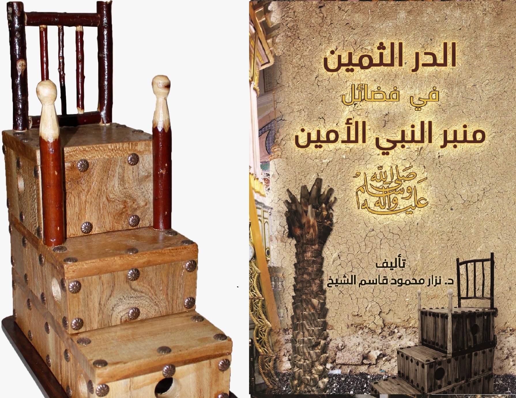 كتاب يتحدث عن المنبر النبوي وتاريخ صنعه ومقاساته على العهد النبوي مع نموذج خشبي صنع يدوي للمنبر من شجر طرفاء المدينة مقاس34*25*13