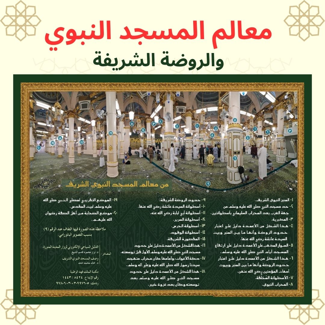 لوحة معالم الروضة الشريفة صورة بانورامية للروضة الشريفة تبين أسماء الأسطوانات وحدود الروضة وبعض المعالم المهمة بها مثل مكان أهل الصفة والمحراب والمنبر... المقاس يبدأ من 120*70 سم